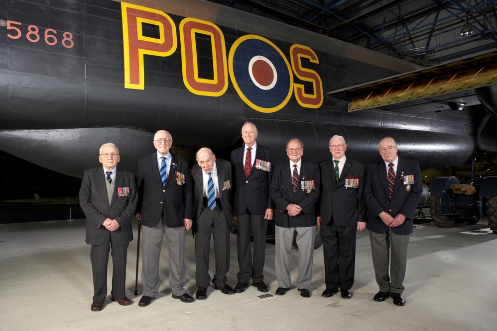 Below, left to right: W/O John Banfield, Wireless Operator; W/O Arthur Smith, Flight Engineer; F/lt Gordon Mellor, Navigator; W/C John Bell, Bomb Aimer; F/Lt George Dunn, Pilot; W/O Harry irons, Mid Upper Gunner and W/O Dave Fellows, Rear Gunner - all former Bomber Command Halifax crew, from various squadrons.