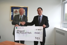 FTA President Stewart Oades (left) presenting the £50,000 cheque to Chris Saunders of Transaid (right).