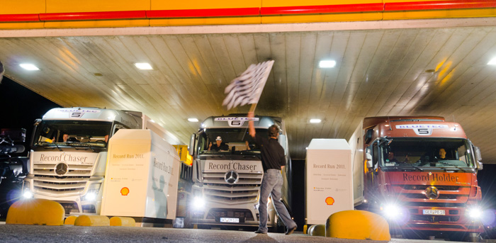 Shell has supplied the fuels and lubricants for Daimler's 10,000km 'Record Run 2011' to test the fuel efficiency of its newest truck series. Shell is the exclusive fuels and lubricants supplier for Daimler's road test of its new Actros Euro V and Actros Euro VI trucks.