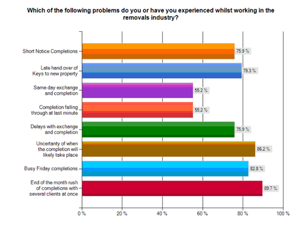 The survey found that there are various problems experienced, by both removal firms and their clients, when dealing with the completion process of buying and selling property in the UK. Problems such as end of the month completions, late hand over of keys, uncertainty of the exact completion date until the last minute, busy Friday completions and many other complications were cited as the most problematic issues experienced by removers on a daily basis.