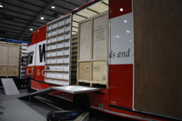 | The Krypton Factor comes to Telford The packing competition at Telford, devised by M&G Transport, looked like it had been created by a fan of the Krypton Factor – the ITV game show that graced our Monday nights until 1995. And so it proved that superhuman skills were needed to complete the task. The idea was simple. Two removal specialists from M&G Transport, Paul Lancett and Richard Mason, packed a storage pallet with cartons and packed items, then unloaded the box. All the contestants had to do was put them back where they belonged in the shortest possible time. Sounds easy enough. Well, know it wasn’t. It was, in fact, very tricky. Nobody managed to get all the packages back in the box and everyone one was penalised 2 minutes for each piece left out. In the end it was the chaps from Britannia Bennetts, Alan Bennett and Nigel Gilks, who did the best job and went home with the trophy. Just to demonstrate that it was indeed possible, Paul and Richard tidied up after the competition by putting everything away. Mind you, they cheated – they’d done it once before! Photos: top: against the clock – competitors struggled to solve the packing puzzle. Left: Richard Mason and Paul Lancett – the experts. |