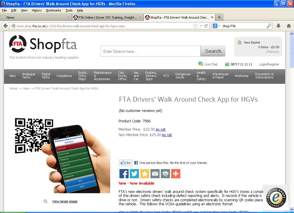 The cost of the system is £22 plus VAT per vehicle for the first year (which includes a set of stickers) and £12 per vehicle for subsequent years. FTA’s Drivers’ Walk Around Check app can be ordered online at http://www.shop.fta.co.uk or by calling 08717 11 11 11.
