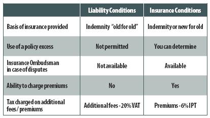 Those choosing the ‘Liability’ option should understand, however, that the insurance is provided on an ‘old for old’ basis, policy excesses are not permitted, the Insurance Ombudsman is not available to handle disputes and it is not possible to earn revenue by charging premiums. By comparison, the ‘Insurance’ option provides the option of ‘new for old’ cover, allows the application of an excess, provides access to the Insurance Ombudsman and allows the option of charging premiums. See the chart below.