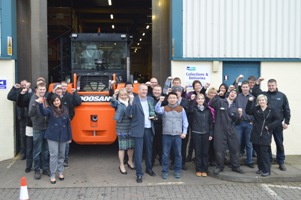 Picture: Staff celebrating at the Northampton headquarters of Doosan Industrial Vehicle UK with director Tim Waples (centre) holding the award