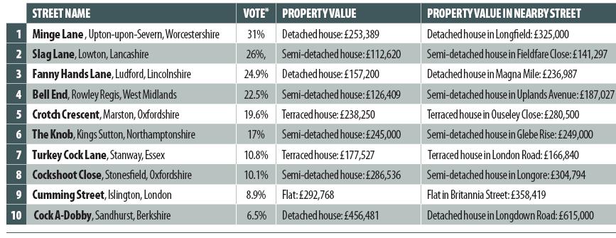 The top 10 streets that people voted as having the most embarrassing names are (the percentage of people who voted each name as embarrassing, followed by the price of a property on the street; followed by an example of the price of a similar property nearby):