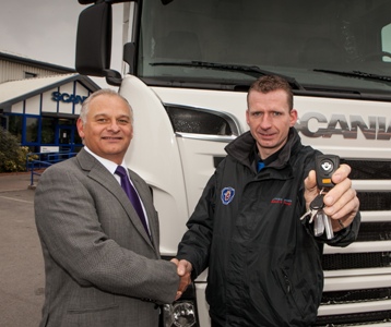 Photos top to bottom: The Scania 560 Road Train; the Scania's cab in Matt's corporate colours; Matt receives the keys from Martin Hay of Scania; admirers gather at a service station on the 28, from Oldenburg to Leer in Germany.