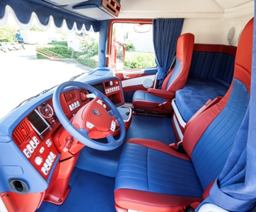 Stepping inside the cab (having taken off your shoes) the surroundings are equally impressive. The plush leather interior in the company colours of red, white and blue, with matching dash and carpets is simply jaw dropping - even the steering wheel is colour coordinated! Creature comforts include a comfortable bed, microwave cooker, coffee maker and even a shower!