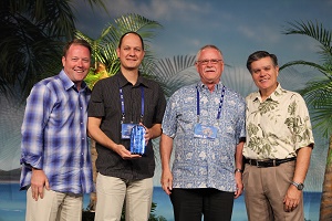 Photos: Top: Alexandra Schmidt, Mexpack, Mexico City, Mexico; centre: Daniel and Paul Fox, Fox Moving & Storage, Cwmbran, Wales; bottom: Martin Sommer and Woody Zobel, ETSA, Bremmen, Germany. All the awards were presented by Jim Gaw, President and COO, Atlas World Group (far left) and Glen Dunkerson, Chairman and CEO, Atlas World Group (far right).