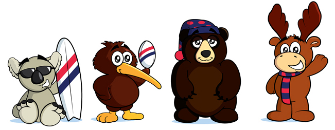 The Moving Gang is a collection of four friendly characters designed to appeal to the whole family. Each one is happy with their living situation but has adapted – for the better. Monty Moose, in Canada, loves ice hockey but has had to get used to the cold. Kev Koala enjoys Australia’s warm climate so much he’s more likely to be found on the beach than up a tree. Stanley the Bear is a sleepy, friendly fellow, who spends his life moving from cave to cave across the United States, with each move resulting in him finding the ideal spot to hibernate. While tomboy Khloe Kiwi, the only girl in the gang, has found a common interest to bond with the others: she loves rugby in her new home country New Zealand.