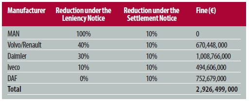 Under the Commission's 2006 Leniency Notice, MAN received full immunity for revealing the existence of the cartel, thereby avoiding a fine of around €1.2 billion. For their cooperation with the investigation, Volvo/Renault, Daimler and Iveco benefited from reductions of their fines under the 2006 Leniency Notice. The reductions reflect the timing of their cooperation and the extent to which the evidence they provided helped the Commission to prove the existence of the cartel [see The Mover, May 2016, page 28, ‘The dangers of anti-competitive conduct’].