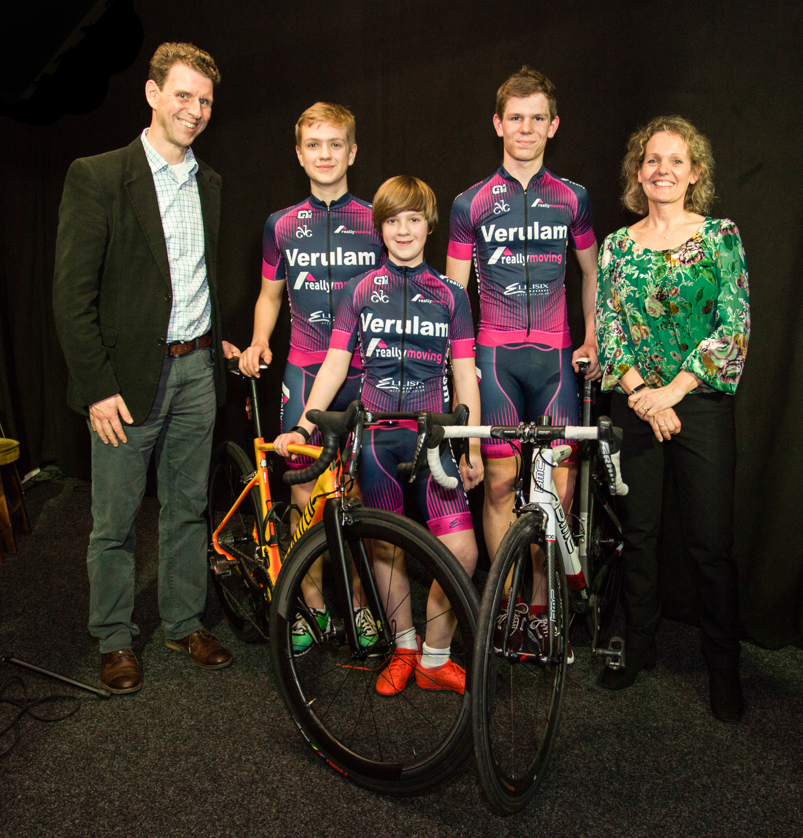 Photo: Rob Houghton and fellow Director Rosie Rogers with members of the Verulam reallymoving.com Racing Team.