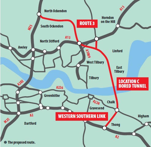 The planned route will run from the M25 near North Ockendon, cross the A13 at Orsett before crossing under the Thames east of Tilbury and Gravesend. A new link road will then take traffic to the A2 near Shorne, close to where the route becomes the M2. The route was identified by the majority of nearly 47,000 respondents to a consultation on the best solution for reducing traffic and congestion at the Dartford Crossing and for boosting the economy by improving links to London and the Channel ports.
