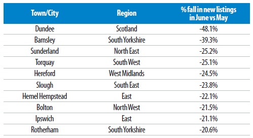The following table shows the ten UK towns and cities that experienced the biggest decreases in new property listings in June versus May: