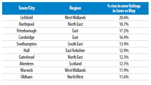 The following table shows the ten UK towns and cities that experienced the biggest increases in new property listings in June versus May: